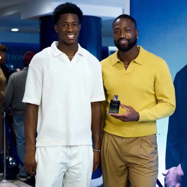 费城76人队新星VJ-埃奇库姆与NBA传奇球星德维恩-韦德的合影近日引发关注。这张由NBA Retweet在社交媒体平台发布的照片中,今年选秀大会的探花秀与热火名宿并肩而立,配文"VJ-埃奇库姆和德维恩-韦德碰面了"。