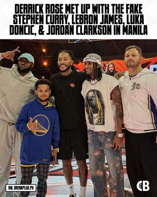 9月19日,前NBA球星德里克-罗斯在菲律宾马尼拉参加篮球推广活动期间,与多位NBA球星的模仿者合影留念。现场照片显示,罗斯身旁聚集了勒布朗·詹姆斯、斯蒂芬·库里、乔丹·克拉克森和卢卡·东契奇的高仿版本,画面颇具趣味性。